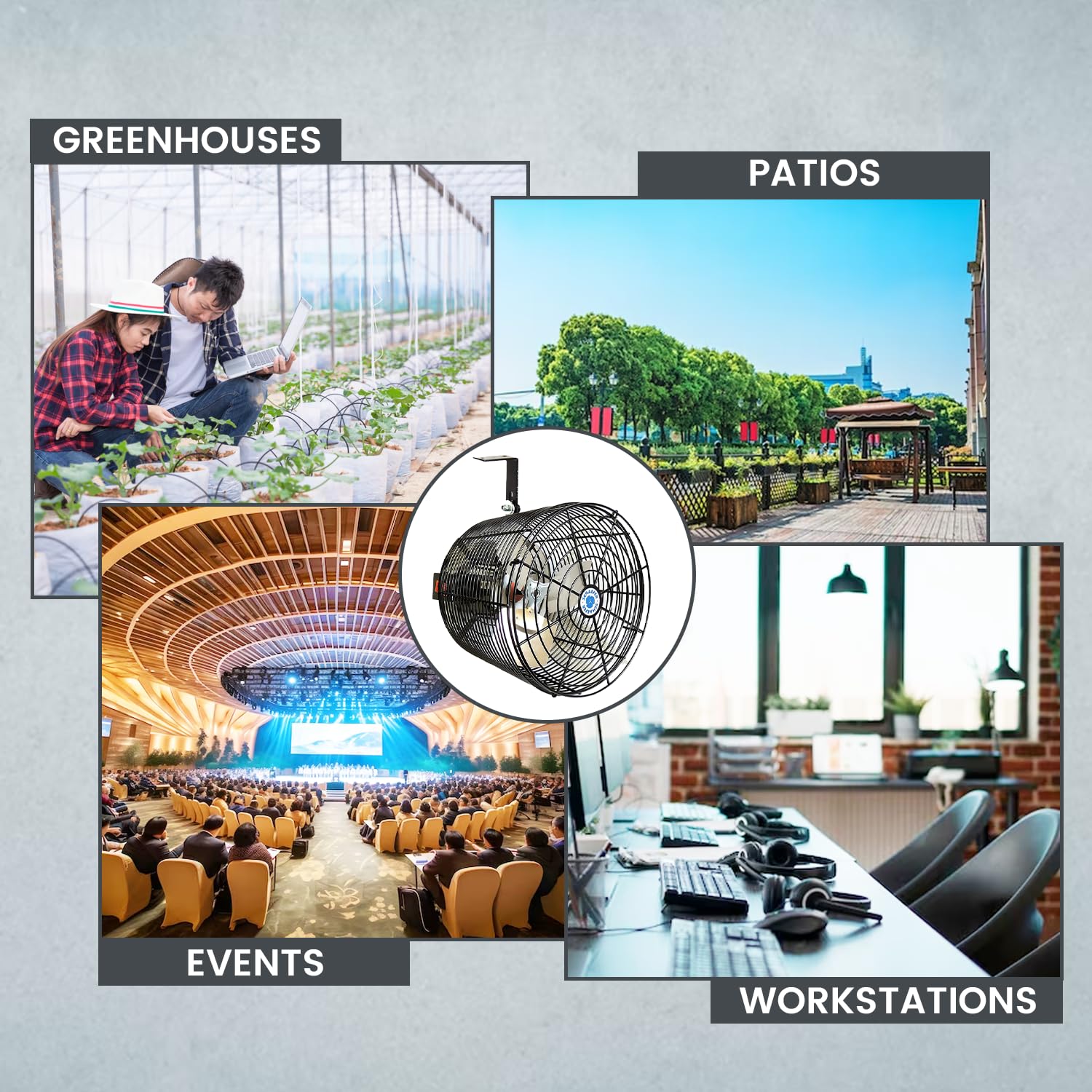 - QUIETER COOL: Experience effective temperature control with the deep-guard design of this wall-mounted fan, minimizing noise without compromising on safety. It's the outdoor fans' solution for events, blending performance and tranquility. FAN BLADES: Includes 3 Aluminum Metallic Blades, Powder Coated Steel Black Guard. 1470 CFM-Free Air