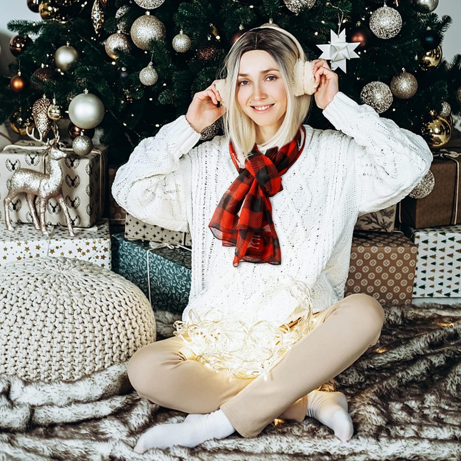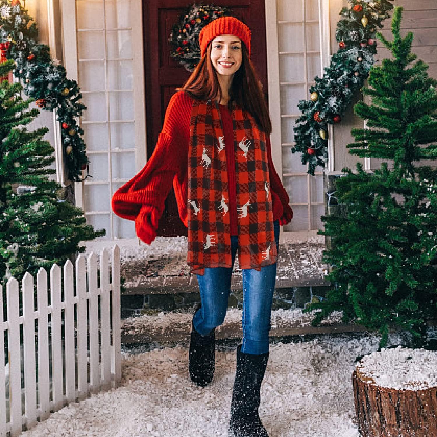 - Unique style: Christmas scarfs for women dressy with classic red and black plaid, vintage and fashionable. The design of cute elks pattern make christmas themed scarfs simple and versatile, and add appeal and glamour for your wear.