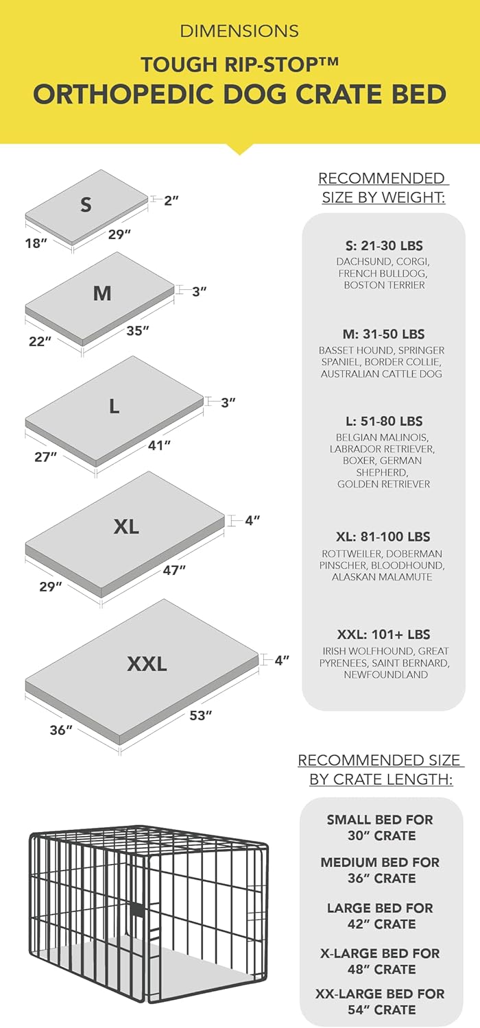 - Orthopedic Support: The solid foam mattress provides dense, firm support for your dog's joints, hips, and spine for optimal comfort in the crate. Unlike egg crate foam and other cheap, flimsy mattresses, our orthopedic crate beds don't lose support or flatten over time, even for the biggest and heaviest of breeds. Mattress thickness varies by bed size, ensuring the perfect balance between comfort and firmness for every dog breed.