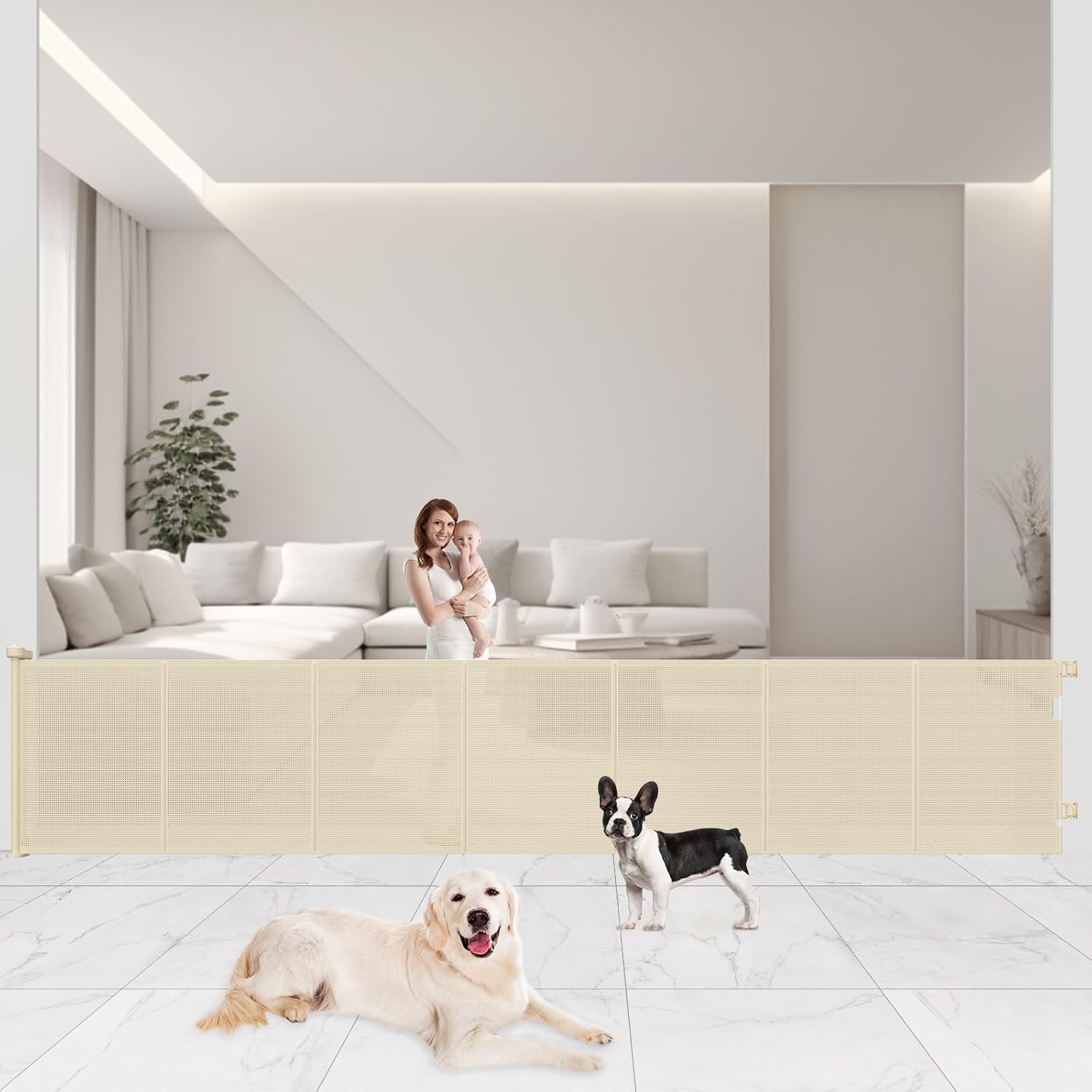 - 120" Extra Wide Retractable Design: Extend our retractable baby gate up to 120" wide, with 41" heightened gates preventing pets from jumping out. Designed to save space, this dog gate is convenient when needed and easily tucked away out of sight when not in use. Note: Please ensure the installation height is above 41" before purchasing