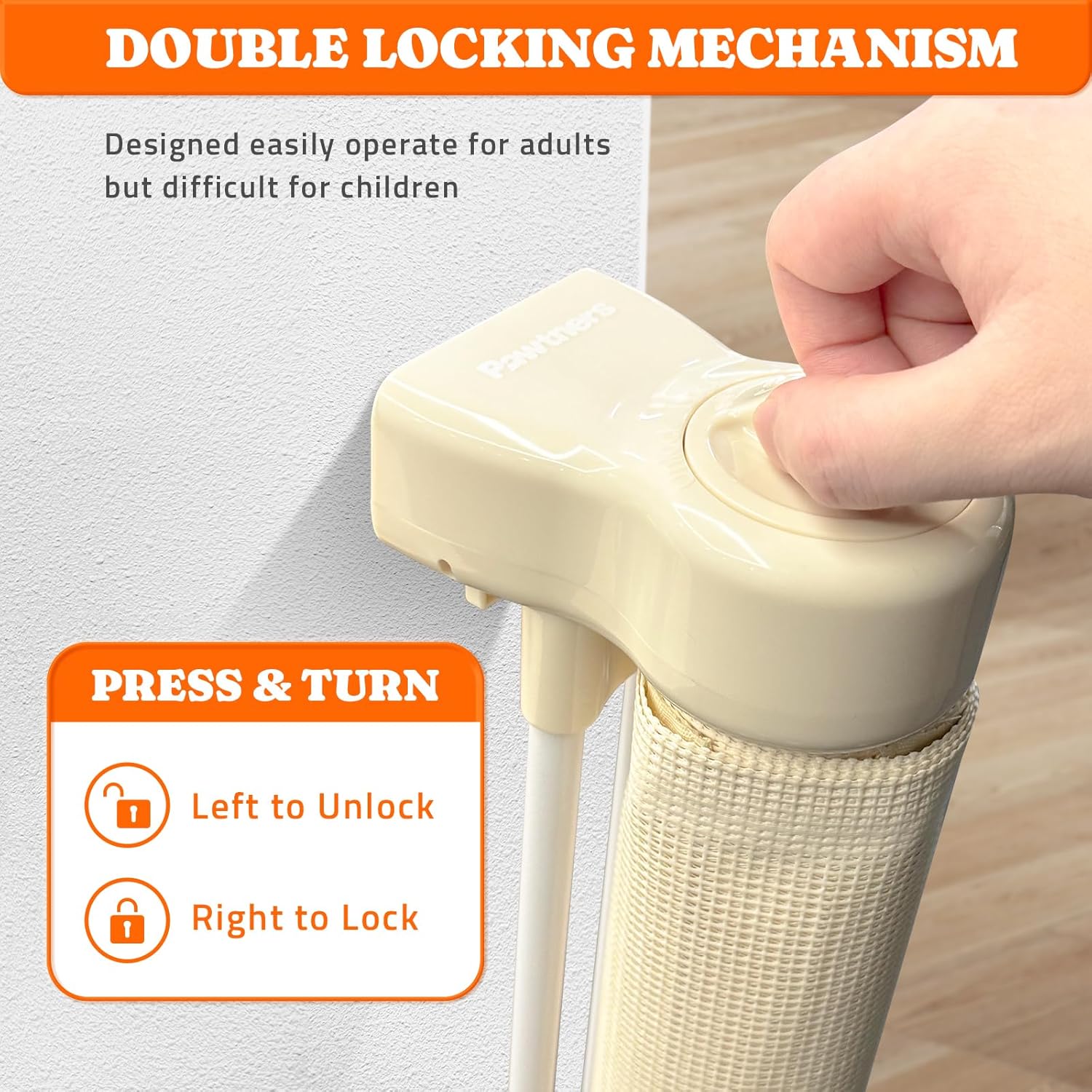 - Double Locking Mechanism: The knob (Press & Turn Design) at the top of the baby gate with cat door, especially the tall baby gate, ensures easy use for adults—open and close with one hand. Meanwhile, curious little ones won't be able to unlock this secure safety gate