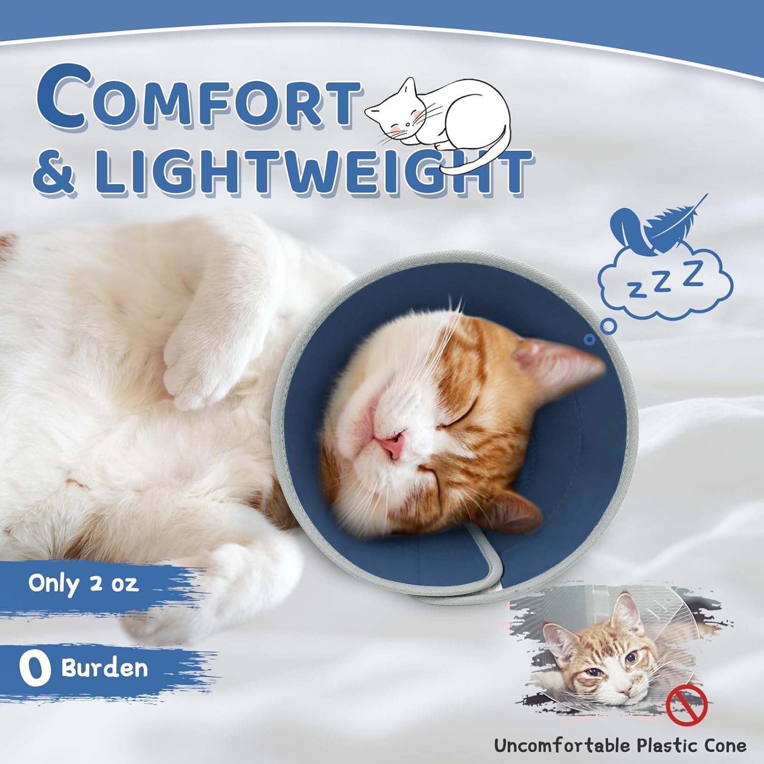 - ăComfortable Kitten Coneă: This soft cone for cats is made of high-quality EVA material and PU fabric, comfortable and durable, lightweight and soft. It has improved the heavy, stuffy, and uncomfortable problems of the hard plastic Elizabethan collar. Your lovely cat will feel extra comfortable wearing it. And the foldable design allows your cute pet to eat normally, sleep relaxed, and enjoy playing as if it's not wearing anything