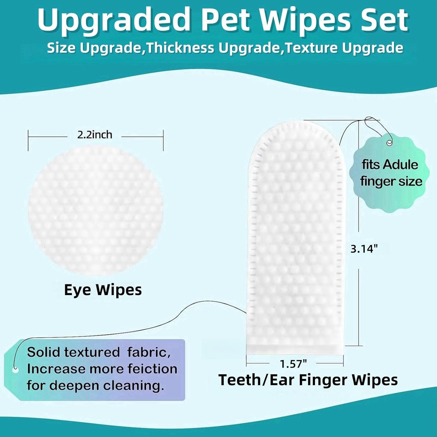 - 【Safe Ingredients Excellent Design】The wipes are designed to fit fingers,made of high-quality non-woven fabric and designed with exquisite pearl patterns on both sides, which increases friction,fits the structure of cats' and dogs' ears and teeth,provides deep cleaning.Pet wipe set are enriched with EDI water,gentle glycerin,tea tree extract, witch hazel extract and aloe vera extract,making them suitable for pets(dogs,cats etc) of all ages,including those with sensitive skin.Alcohol-free,no harsh chemicals and PH balanced.Safe if licked or ingested.
