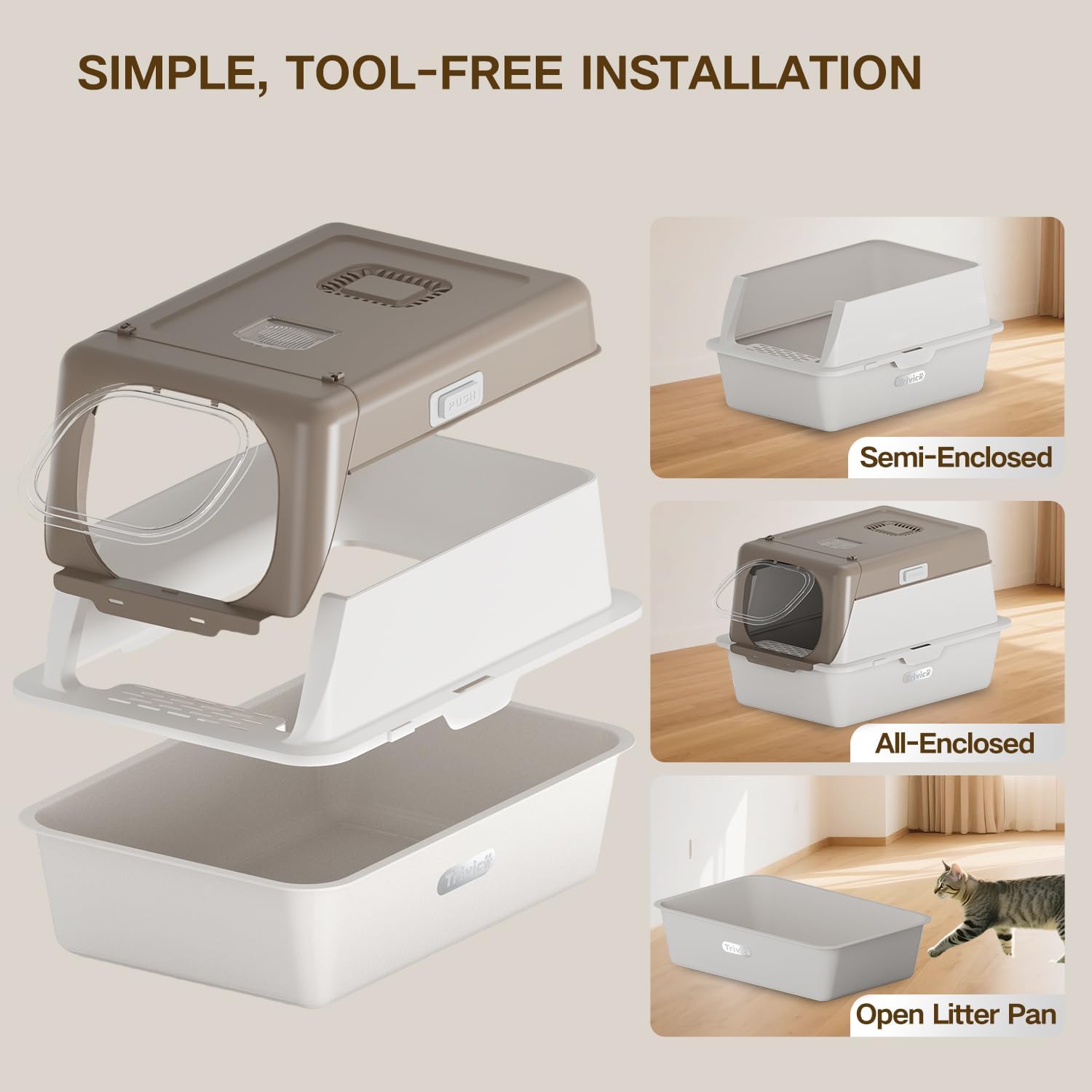 - Dual Mode – Semi-Enclosed or Fully-Enclosed Flexibility Customize your cat’s privacy by using the litter box as either a semi-open or fully enclosed system. The upper lid features ventilation holes to improve airflow and reduce moisture buildup. Comes with a charcoal filter to neutralize odors and purify the surrounding air.