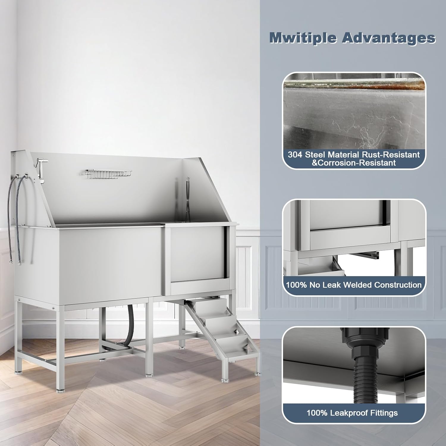 - LEAK-FREE DRAINAGE:Our stainless steel dog washing station boasts seamless welding ensure that the tub bottom and water pipe interface for a leak-free experience.Raise the rear and side panels, a sealed door seam, and the triple design keep splashes contained and keep the ground dry. The 47.24L "× 24.80" W anti-slip mat and drainage system while the anti-slip mat collects hair to prevent clogs. 1.77" big diameter drainage hose allows for quick water removal.