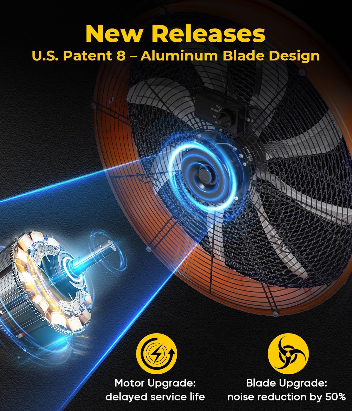 - Quality Design Heavy Duty Metal Fan, all Metal Construction with Individually Balanced 8 Aluminum Blades, a handle is placed at the top along with 2 smooth rubber wheels at the bottom to support easy carrying and moving. 3-speed high velocity fan setting with a rotary switch on the back housing.